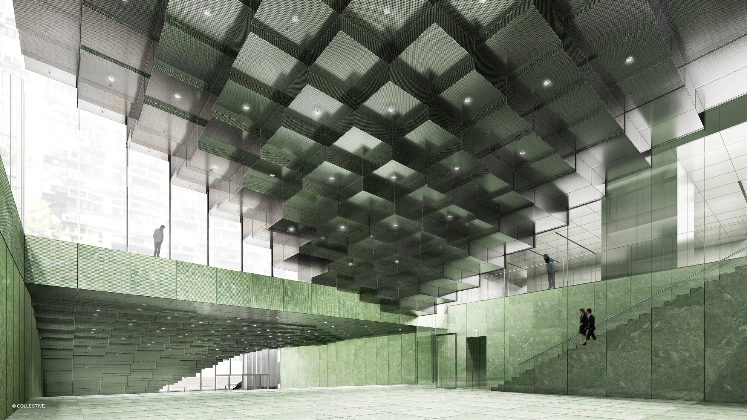 Inserted below the Feature Steps are two connected interior auditorium spaces – the upper and lower auditorium. The two spaces may be used as a single event space or partitioned to be used separately. The seats of the upper auditorium can also be retracted, transforming the room into a multipurpose open plan, thereby offering an event space as an additional amenity to office tenants. Architecturally, the auditorium space is distinguished by a unique stepped ceiling of varying heights, geometrically reflecting the parametric and pixelated nature of the exterior feature steps above.