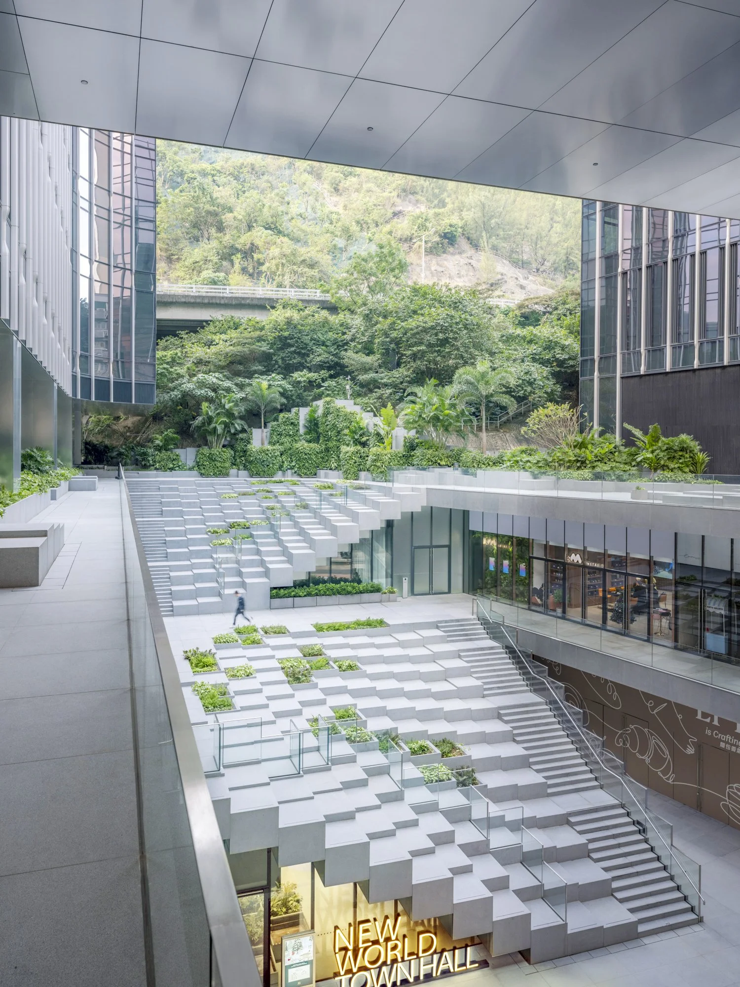 The podium is made up of 3 levels and comprises four main program components: 1) commercial retail and F&B shops, 2) two main office lobby entrances for each of the twin towers, 3) a reconfigurable and multifunction auditorium, and finally 4) a large continuous green landscape which extends from the second floor down to the ground level. Forming the centerpiece of all this is a cascading landscape of steps – the ‘feature steps’ – which rhythmically winds its way up and down, left and right, connecting each level of the separated podium. Its parametric surface is expressed as a series of pixelated steps with varying heights, thereby creating a landscape of stairs, seats, and planters. At the top of the podium, the pixelated steps conglomerate into another landscape of tree planters and green walls, blending into the site’s rising green back-drop. In addition to effectively linking the base of the two towers, this fabricated landscape, and its curated greenery is meant to be an intentional extension of the natural green mountainside into the city’s urban fabric.