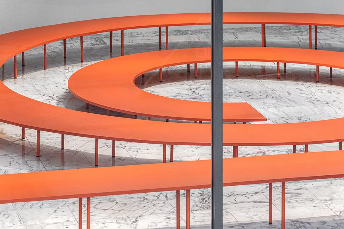 The ribbon design is a result of intensive research on ‘Spaces for Negotiations’, which accommodates all types of encounters during diplomacy, incorporating the essences of assembly formats from the House of Commons in the UK (facing each other confrontationally); UN General Assembly (directionally front facing); Taiwan Legislative Yuan and House of Representative Chambers in USA (concentrically facing the middle). The winding ribbon form and varying heights breaks down the hierarchy between a speaker and the audience, creating an egalitarian space for discussions. The space doubles up as a study area or leisure space for the public and visitors at the Biennial when no events are planned in the space.